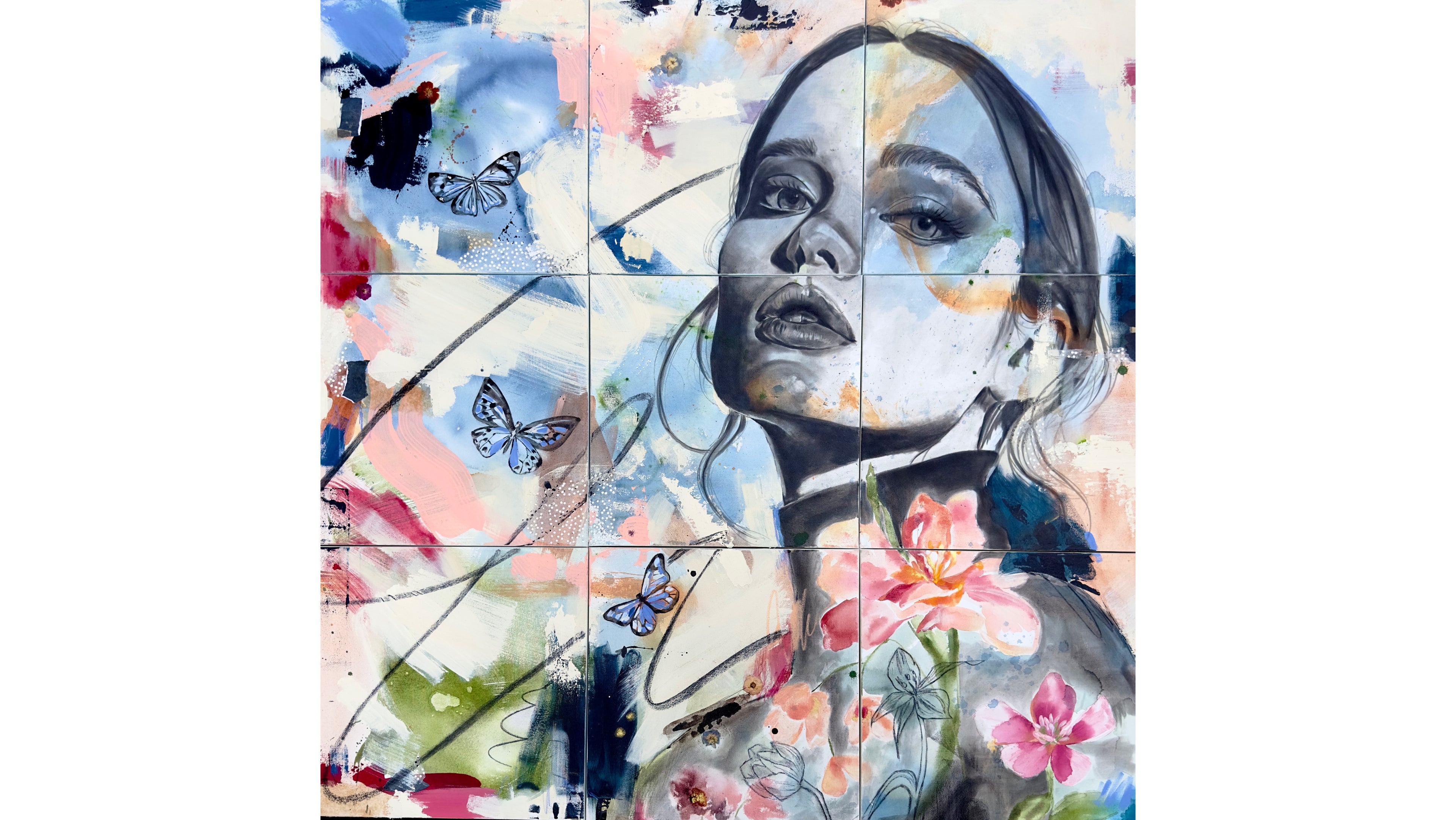 60x60 inches | Nine canvases, One story. Created for TAC Gallery’s 25th Anniversary, What Remains is a modular portrait exploring presence, fragmentation, and quiet strength.Collectors can display it whole or in parts — the arrangement is yours.— Gina
