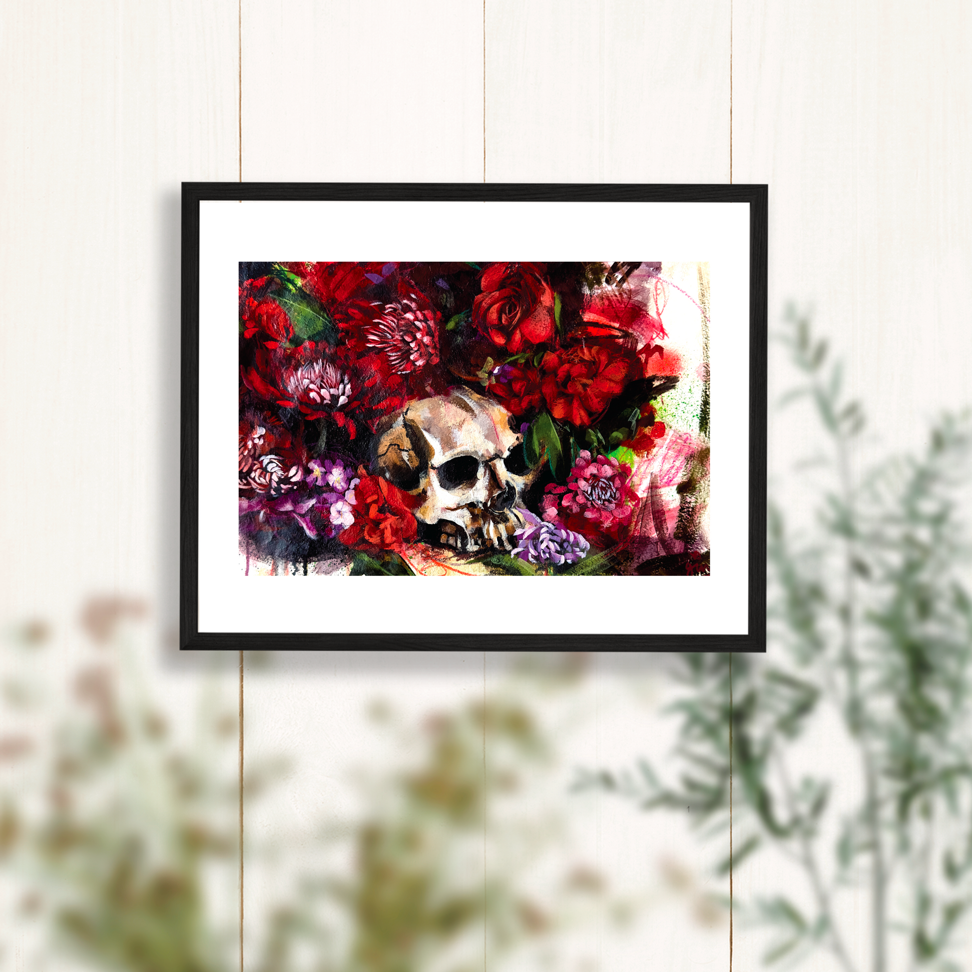 Red Flowers Skull Painting Art Print - 11x14 inches